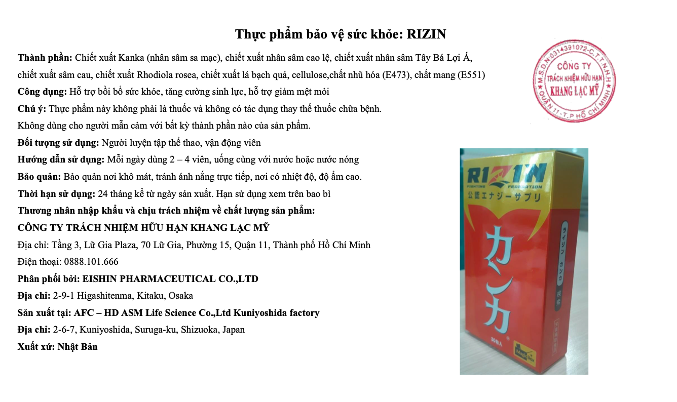 Sản phẩm thực phẩm bảo vệ sức khỏe quảng cáo vi phạm nêu trên do Công ty trách nhiệm hữu hạn Khang Lạc Mỹ (địa chỉ: Tầng 3, Lữ Gia Plaza, 70 Lữ Gia, Phường 15, Quận 11, TP. Hồ Chí Minh) công bố và chịu trách nhiệm về sản phẩm. Quá trình hậu kiểm, Công ty trách nhiệm hữu hạn Khang Lạc Mỹ không thừa nhận các website nêu trên của Công ty trách nhiệm hữu hạn Khang Lạc Mỹ, Công ty không chịu trách nhiệm về việc quảng cáo các sản phẩm thực phẩm bảo vệ sức khỏe Rizin trên trang mạng nêu trên.