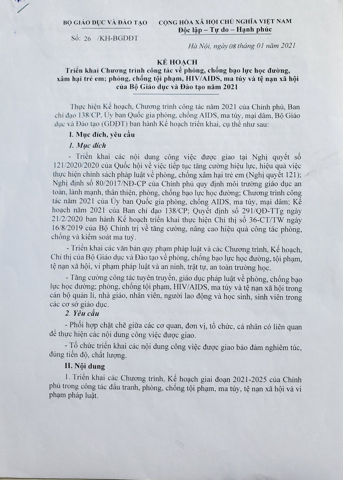 Ngày 8/1/2021, Thứ trưởng Bộ GD&ĐT, Ngô Thị Minh có ký ban hành Kế hoạch số 26/KH-BGDĐT, về việc triển khai “Chương trình công tác phòng, chống bạo lực học đường, xâm hại trẻ em; phòng, chống tội phạm, HIV/AIDS, ma túy và tệ nạn xã hội của Bộ GD&ĐT năm 2021”.