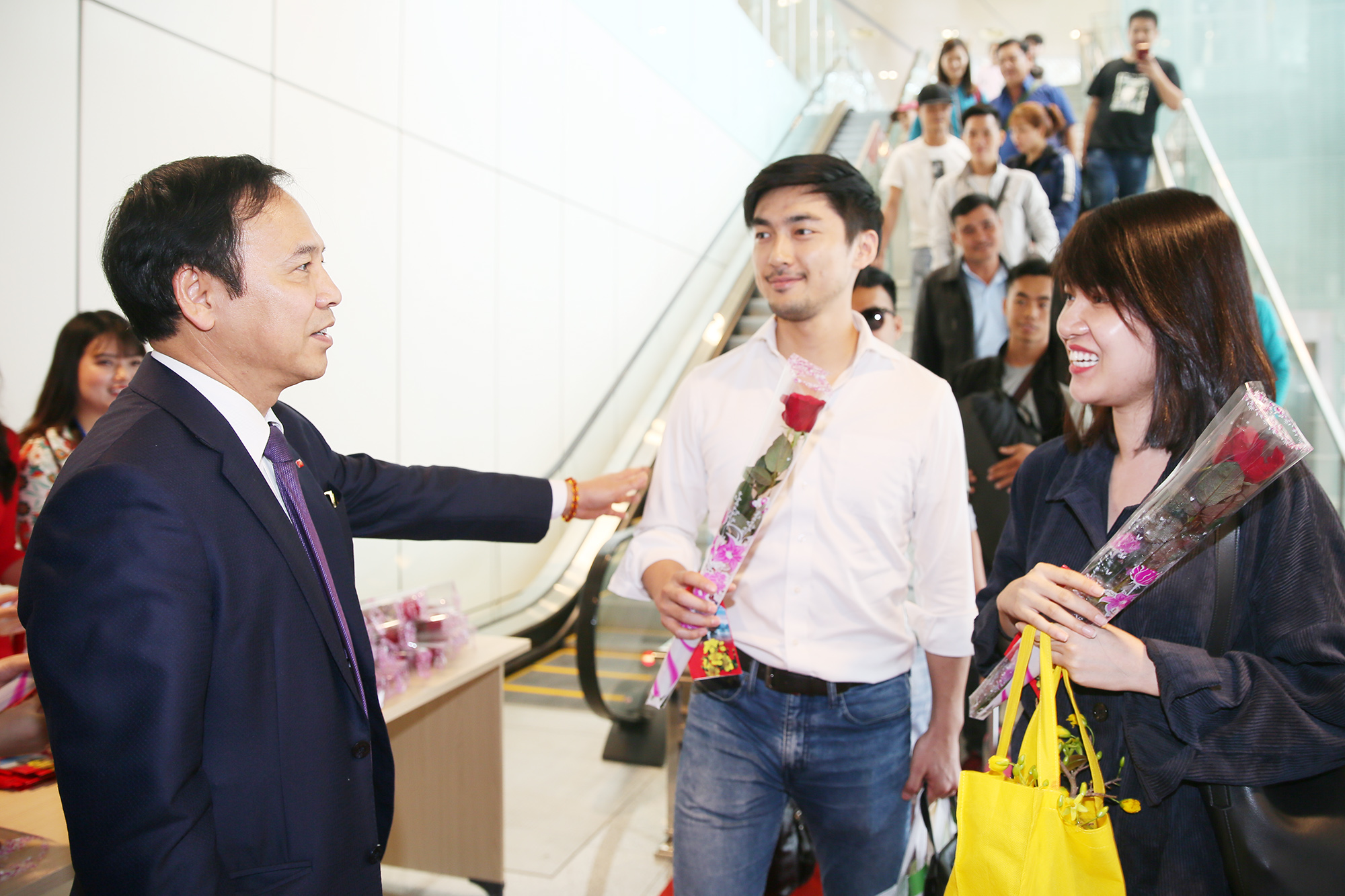 Phó Chủ tịch Thường trực UBND tỉnh Đặng Huy Hậu chào đón những hành khách đầu tiên "xông" Cảng Hàng không quốc tế Vân Đồn. |
