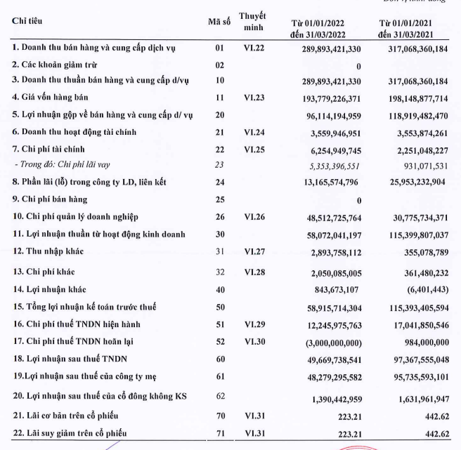 Trong kỳ, doanh thu tài chính tăng nhẹ 6 triệu đồng lên gần 3,6 tỷ đồng, tuy nhiên chi phí tài chính tăng hơn 4 tỷ đồng (178%) lên 6,3 tỷ đồng, chủ yếu do giảm lỗ chênh lệch tỷ giá 418 triệu đồng) và tăng chi phí lãi vay (4,422 tỷ đồng) so với cùng kỳ quý 1/2021.