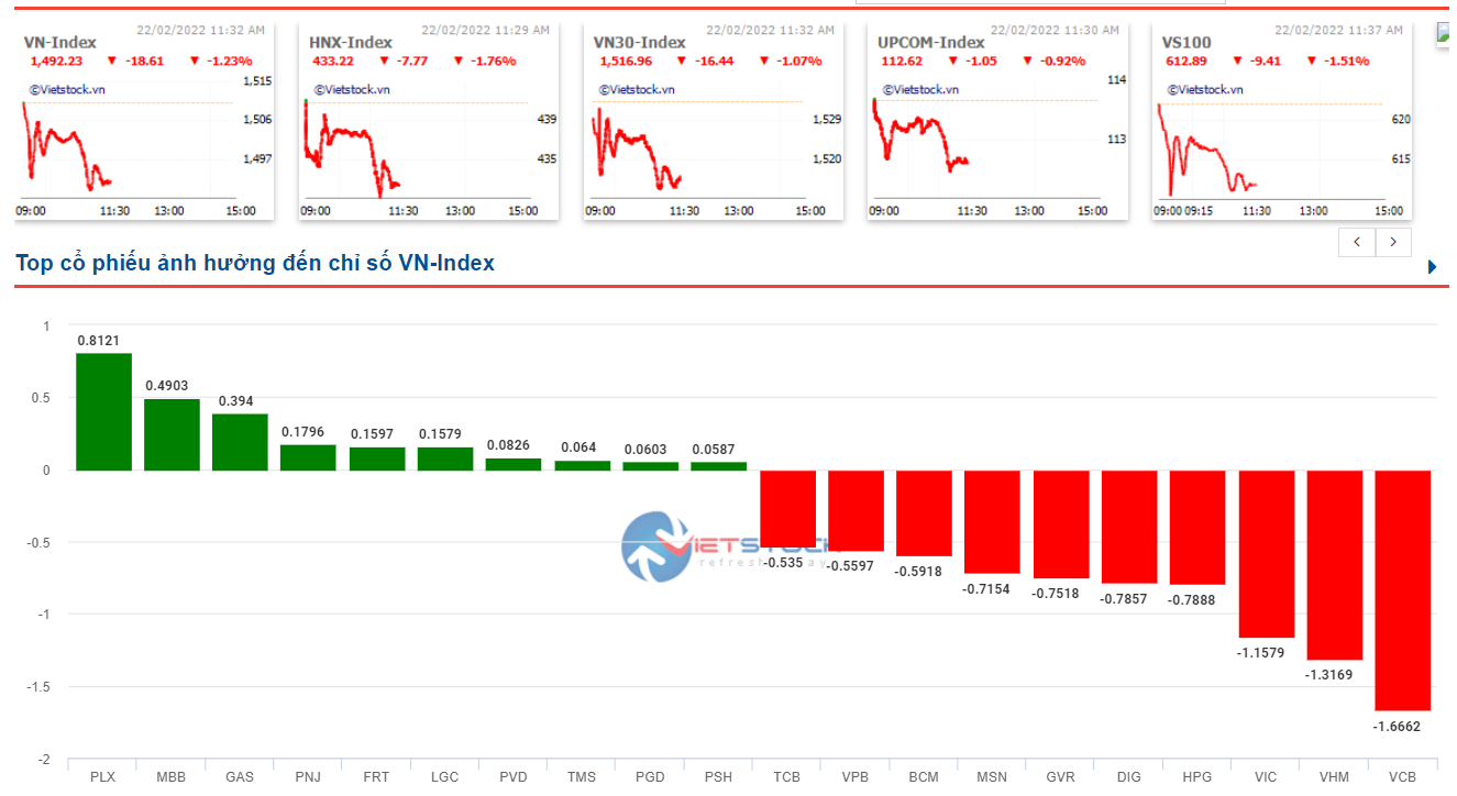 Chốt phiên giao dịch sáng 22/2, chỉ số VN-Index giảm 18,61 điểm (1,23%) xuống 1.492,23 điểm; HNX-Index giảm 1,76% xuống 433,22 điểm và UPCom-Index giảm 0,92% xuống 112,62 điểm. Thanh khoản thị trường ở mức thấp với giá trị giao dịch 3 sàn đạt hơn 19.200 tỷ đồng.