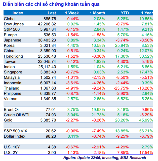 Theo Báo cáo chiến lược thị trường tuần từ 23-27/6 của Công ty Chứng khoán MB (MBS), thị trường chứng khoán toàn cầu phần lớn giảm điểm trong tuần vừa qua, ở thị trường chứng khoán Mỹ: S&P 500 giảm 0,2%; Dow Jones tăng 0,02%; và Nasdaq tăng 0,2%.
