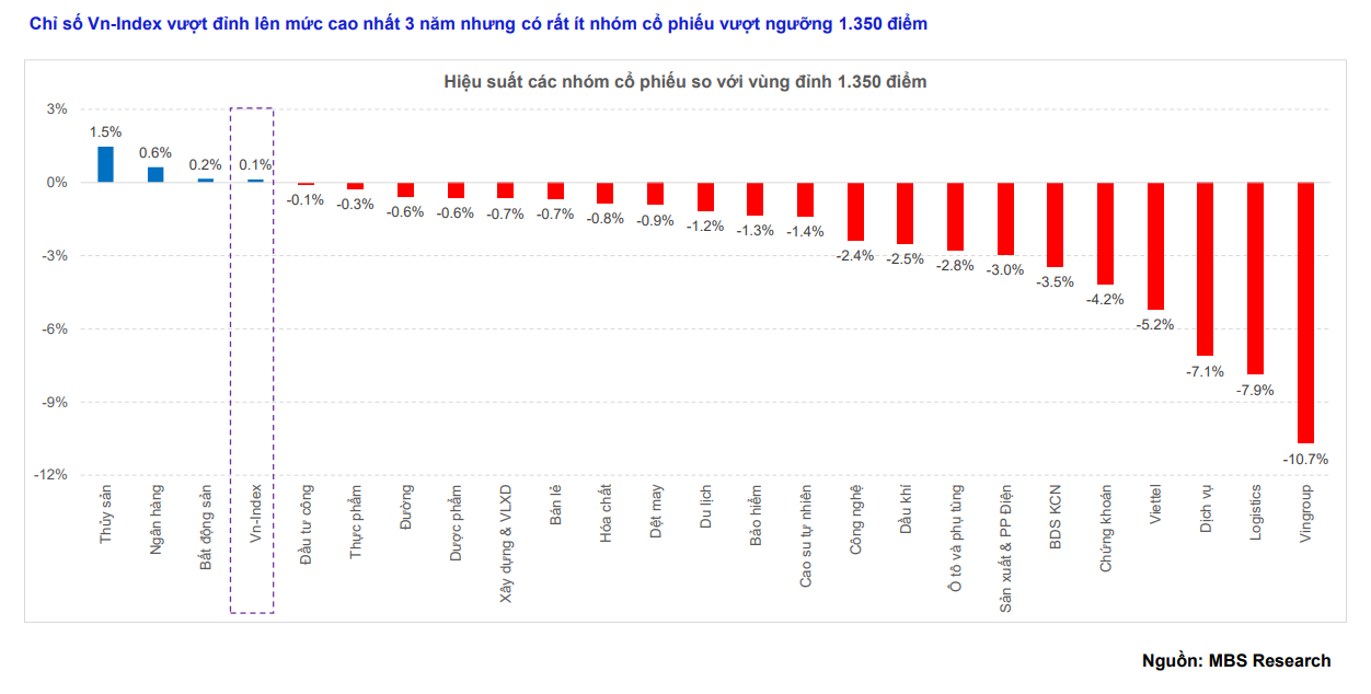Bên cạnh đó, dù chỉ số Vn-Index đã vượt đỉnh nhưng có rất ít nhóm cổ phiếu theo kịp đà tăng của chỉ số, ngoại trừ: Thủy sản, Ngân hàng, Bất động sản, … Một số nhóm cổ phiếu vẫn còn cách đỉnh như Vingroup (-10,7%), Logistics (-7,9%), Chứng khoán (-4,2%), … Như vậy về mặt kỹ thuật, thị trường đang tạo sự phân kỳ về mặt kỹ thuật.