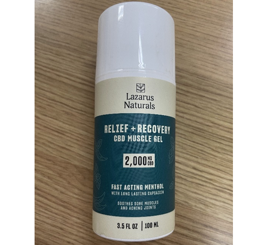 Lọ nhựa có nhãn hiệu “Lazarus Naturals RELIEF + RECOVERY CBD MUSCLE GEL 2000 MG CBD" loại 100ml có ma túy loại Delta-9-tetrahydrocanabinol.