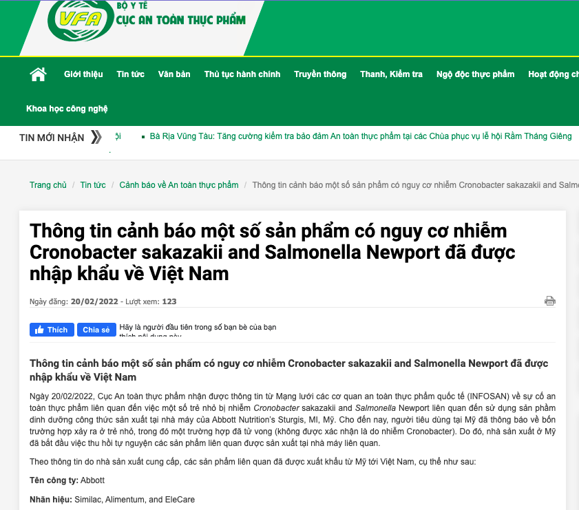 Cục An toàn thực phẩm cho biết theo thông tin do nhà sản xuất cung cấp, các sản phẩm liên quan đã được xuất khẩu từ Mỹ tới Việt Nam, cụ thể là sản phẩm dinh dưỡng công thức dạng bột cho trẻ nhỏ; nhãn hiệu: Similac, Alimentum, and EleCare; tên công ty là Abbott.