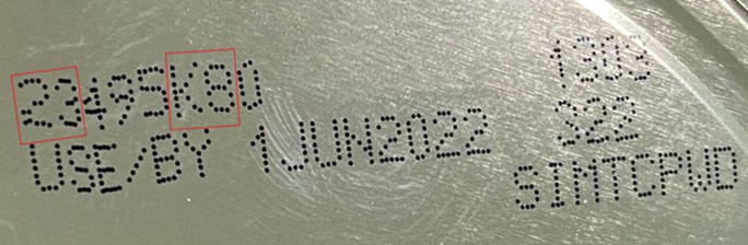 Hai số đầu tiên của mã số từ 22 tới 37 và mã số trên bao bì chứa ký hiệu K8, SH, hoặc Z2, và hạn sử dụng từ 1-4-2022 trở về sau.