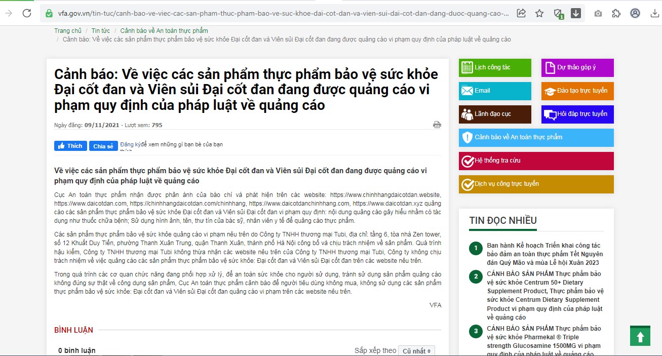 Quá trình hậu kiểm, Công ty TNHH thương mại Tubi không thừa nhận các website nêu trên của Công ty TNHH thương mại Tubi, Công ty không chịu trách nhiệm về việc quảng cáo các sản phẩm thực phẩm bảo vệ sức khỏe: Đại cốt đan và Viên sủi Đại cốt đan trên các website nêu trên.