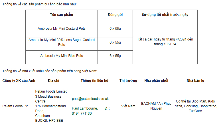 Thông tin về các sản phẩm bị cảnh báo cũng như về nhà xuất khẩu các sản phẩm vàng sữa của Công ty Premier Foods sang Việt Nam
