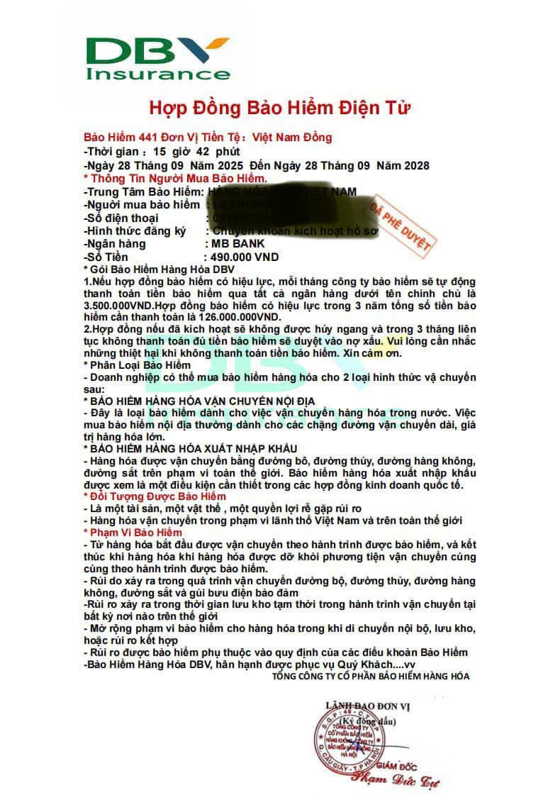 Từ kênh này, một “hợp đồng bảo hiểm điện tử” được gửi cho chị L.K. Tài liệu có đầy đủ logo, con dấu và chữ ký giả, trong đó ghi rõ: Hợp đồng có hiệu lực từ ngày 28/09/2025 đến 28/09/2028, phương thức đăng ký là “chuyển khoản kích hoạt hồ sơ”, và số tiền đã nộp là 490.000 đồng.