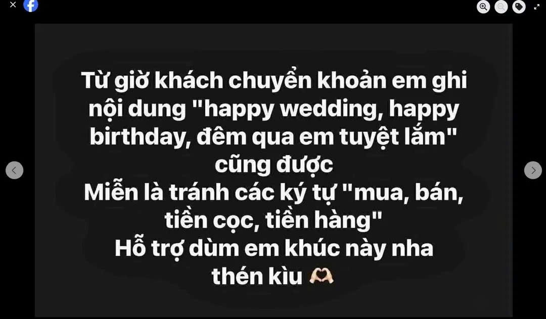 Nhiều người bán hàng trên Facebook và các sàn thương mại điện tử hướng dẫn khách hàng ghi nội dung chuyển khoản chung chung như "happy birthday", "đêm qua em đẹp lắm"… miễn tránh các ký tự như mua, bán, tiền cọc, tiền hàng để che giấu giao dịch mua bán, nhằm giảm doanh thu kê khai và trốn thuế.