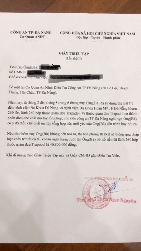 Theo đó, các đối tượng đã giả mạo cơ quan An ninh điều tra- Công an TP Đà Nẵng gửi "Giấy triệu tập" cho người bị hại. Nội dung giấy triệu tập đề cập đến việc người bị hại đã sử dụng thẻ BHYT để khám và nhận thuốc giảm đau Trapadol hàng trăm lần. Đặc biệt, trong thành phần thuốc giảm đau có chứa chất điều chế ma túy tổng hợp nên công an nghi ngờ người sử dụng thẻ BHYT có ý đồ điều chế ma túy, do đó, yêu cầu đến cơ quan điều tra nói rõ. Trường hợp, người lao động không đến thì bên BHXH sẽ khấu trừ số tiền thuốc giảm đau đã cấp thông qua tài khoản ngân hàng. Sau khi gửi giấy triệu tập, các đối tượng sẽ gọi điện hù dọa, đốc thúc người bị hại nộp tiền vào số tài khoản chúng cung cấp.