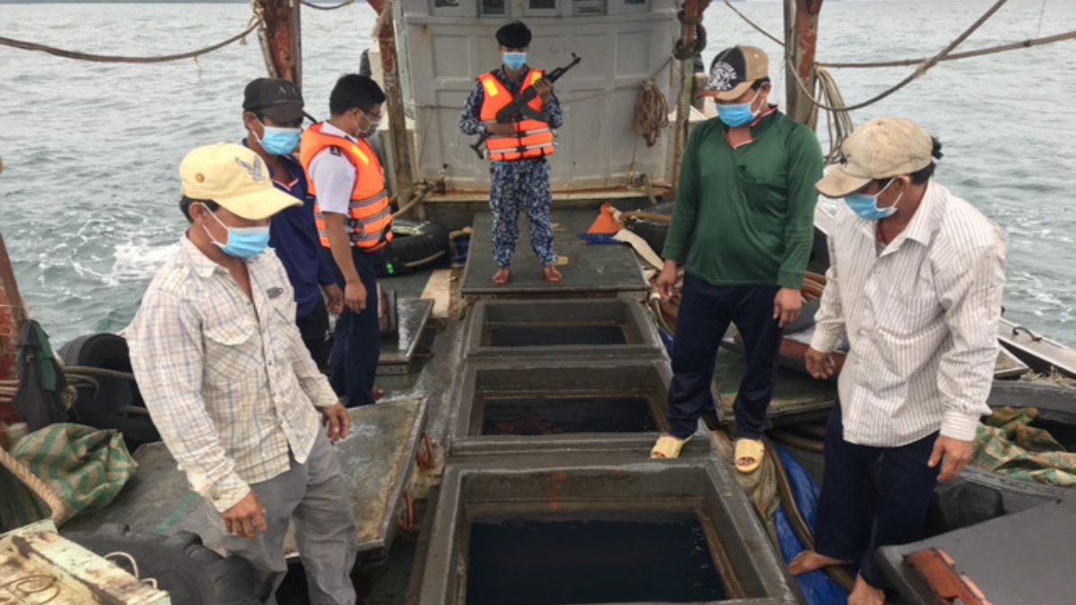 Theo đó, vào hồi 17h ngày 14/7, tại khu vực biển cách Tây Bắc đảo Thổ Chu (Kiên Giang) khoảng 26 hải lý, tổ công tác Đoàn trinh sát số 2 (CSB Việt Nam) đã phát hiện tàu vỏ gỗ số hiệu KG 95945 TS có dấu hiệu nghi vấn.