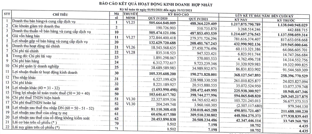 Doanh nghiệp cho biết, sản lượng tiêu thụ quý IV đạt 4.397 tấn - giảm 33%; giá bán bình quân đạt 41,3 triệu đồng/tấn - tăng 4%. Cùng với đó, hoạt động khác ghi nhận lợi nhuận 208 tỷ đồng (chủ yếu từ thanh lý cây cao su).