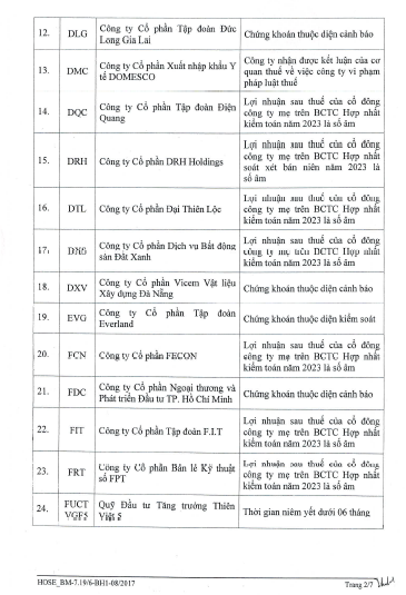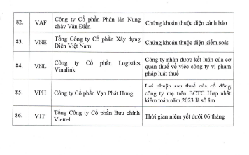 Trong danh sách còn có cổ phiếu AAT do công ty chậm công bố thông tin báo cáo tài chính năm 2023 đã kiểm toán quá 5 ngày làm việc kể từ ngày hết hạn công bố thông tin.