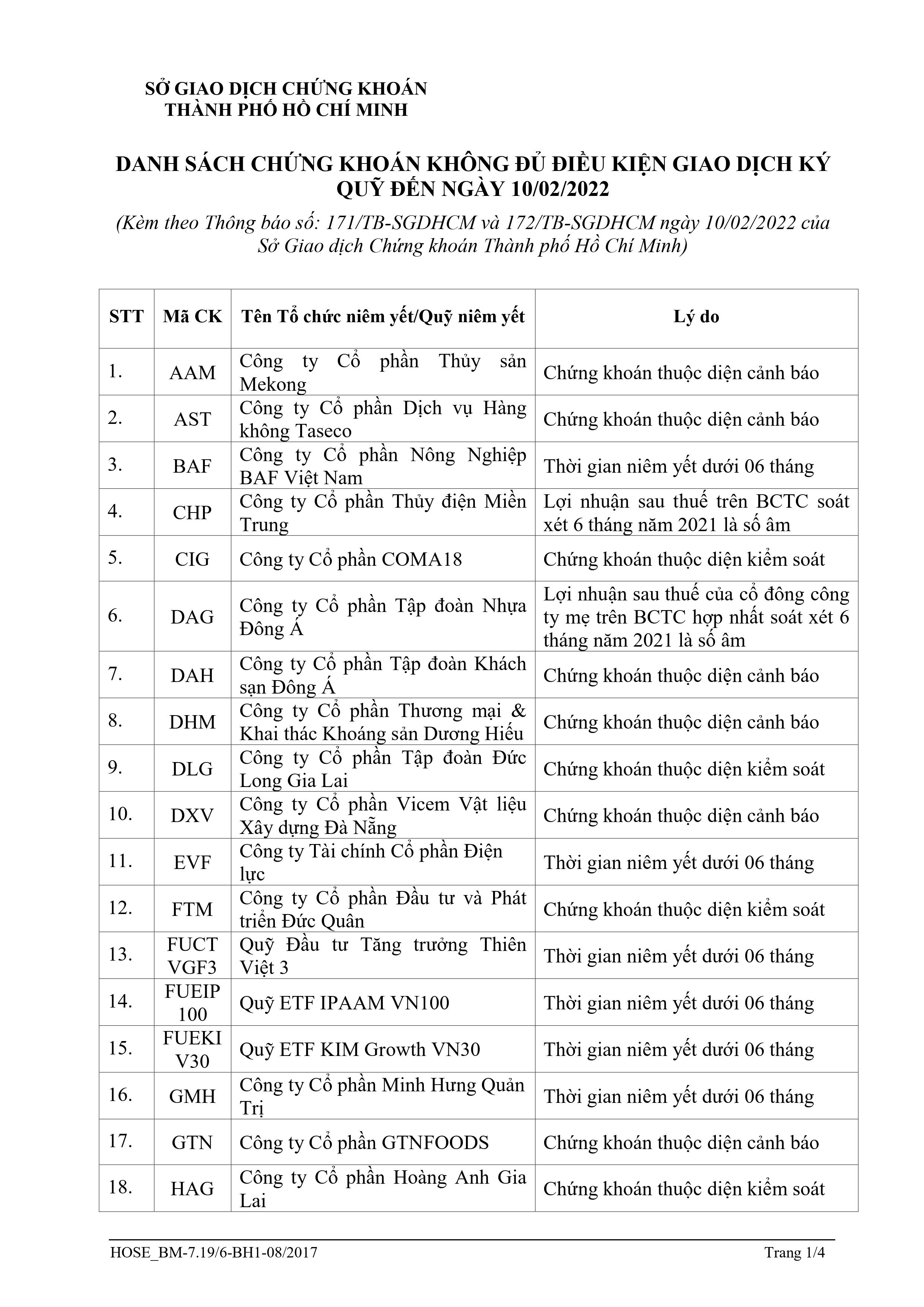 Sở Giao dịch Chứng khoán TP HCM (HoSE) thông báo danh sách 68 mã chứng khoán không đủ điều kiện giao dịch ký quỹ (margin) trong quý I/2022 (tính đến ngày 10/2).