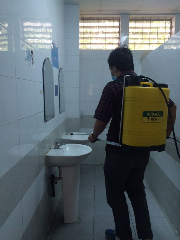 Trường ĐH Khoa học tự nhiên (ĐH Quốc gia TP.HCM) khử trùng các khu vực trong trường trong thời gian sinh viên nghỉ học - Ảnh: PHÙNG QUÁN
