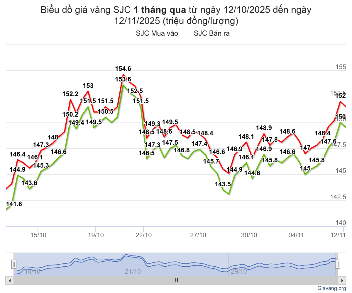 Tính đến 20h ngày 12/11/2025, giá vàng miếng SJC được Tập đoàn DOJI niêm yết ở ngưỡng 149,5-151,5 triệu đồng/lượng (mua vào - bán ra), giảm 500.000 đồng/lượng cả hai chiều. Chênh lệch giá mua vào - bán ra ở ngưỡng 2 triệu đồng/lượng.