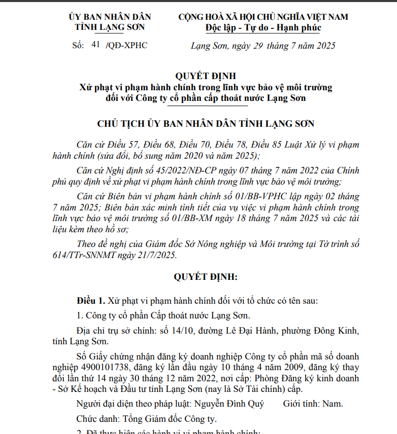 Theo Quyết định 41/QĐ-XPHC ngày 29/7/2025, Công ty cổ phần Cấp thoát nước Lạng Sơn, địa chỉ trụ sở chính tại 14/10, đường Lê Đại Hành, phường Đông Kinh, tỉnh Lạng Sơn bị xác định đã có ba hành vi vi phạm gồm: không thu gom, lưu giữ chất thải nguy hại theo quy định, cụ thể: không thu go, phân loại, lưu giữ các vỏ hộp sơn và can, lọ chứa hoá chất nguy hại để chung tại nhà bể chứa nước và trạm bơm nước sạch W18.; không vận hành không đúng, không đầy đủ quy trình theo yêu cầu về quản lý, vận hành hệ thống đối với hệ thống quan trắc nước thải tự động, liên tục theo quy định, cụ thể: không kiểm tra định kỳ bằng chất chuẩn đối với các thiết bị đo: COD, TSS, pH, NH4 + , DO; và không lưu giữ dữ liệu quan trắc nước thải đúng quy định, trong đó có thông số amoni (NH4+).