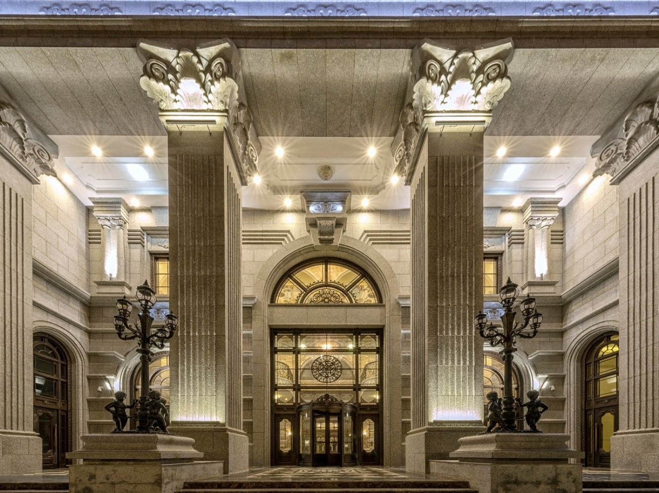 Phía trong sảnh tòa nhà được thiết kế theo phong cách sảnh cung điện cao 12m cũng được ốp hoàn toàn đá marble - loại đá đắt tiền chuyên dùng trong các khách sạn 5 sao trở lên. Trên mái vòm đại sảnh còn có bức tranh trường phái siêu thực do 3 họa sĩ người Ý chuyên vẽ tranh trong điện Kremlin (Nga) trực tiếp vẽ rất kì công, phải treo người vẽ trong vòng 6 tháng mới hoàn thành kiệt tác này.