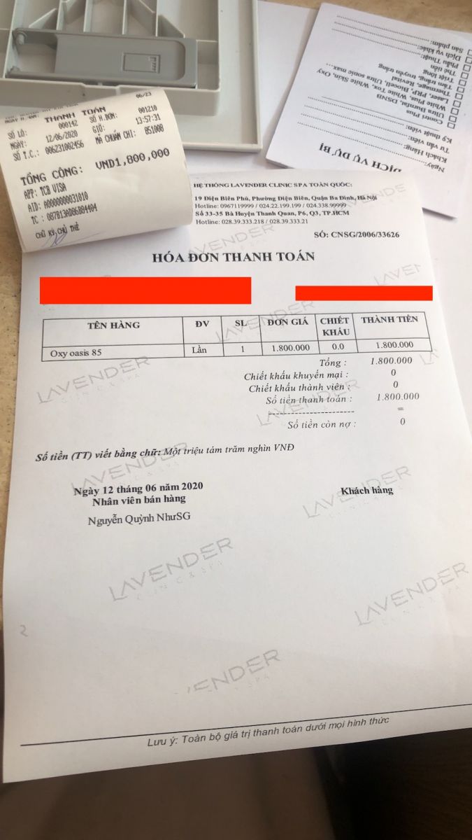 Đáng nói, ngoài việc cung cấp số tài khoản cá nhân cho khách hàng chuyển tiền mua dịch vụ, từ phiếu thu, cho đến hoá đơn thanh toán của Lavender đều không có dấu treo (mộc đỏ). Như vậy, về bản chất phiếu thu và hoá đơn thanh toán này không có giá trị. Điều này đồng nghĩa với việc khách hàng đóng tiền cho Lavender sẽ phải chịu tất cả các rủi ro trong trường hợp xảy ra tranh chấp, mẫu thuẫn…xuyên suốt quá trình cung cấp và sử dụng dịch vụ tại cơ sở này.