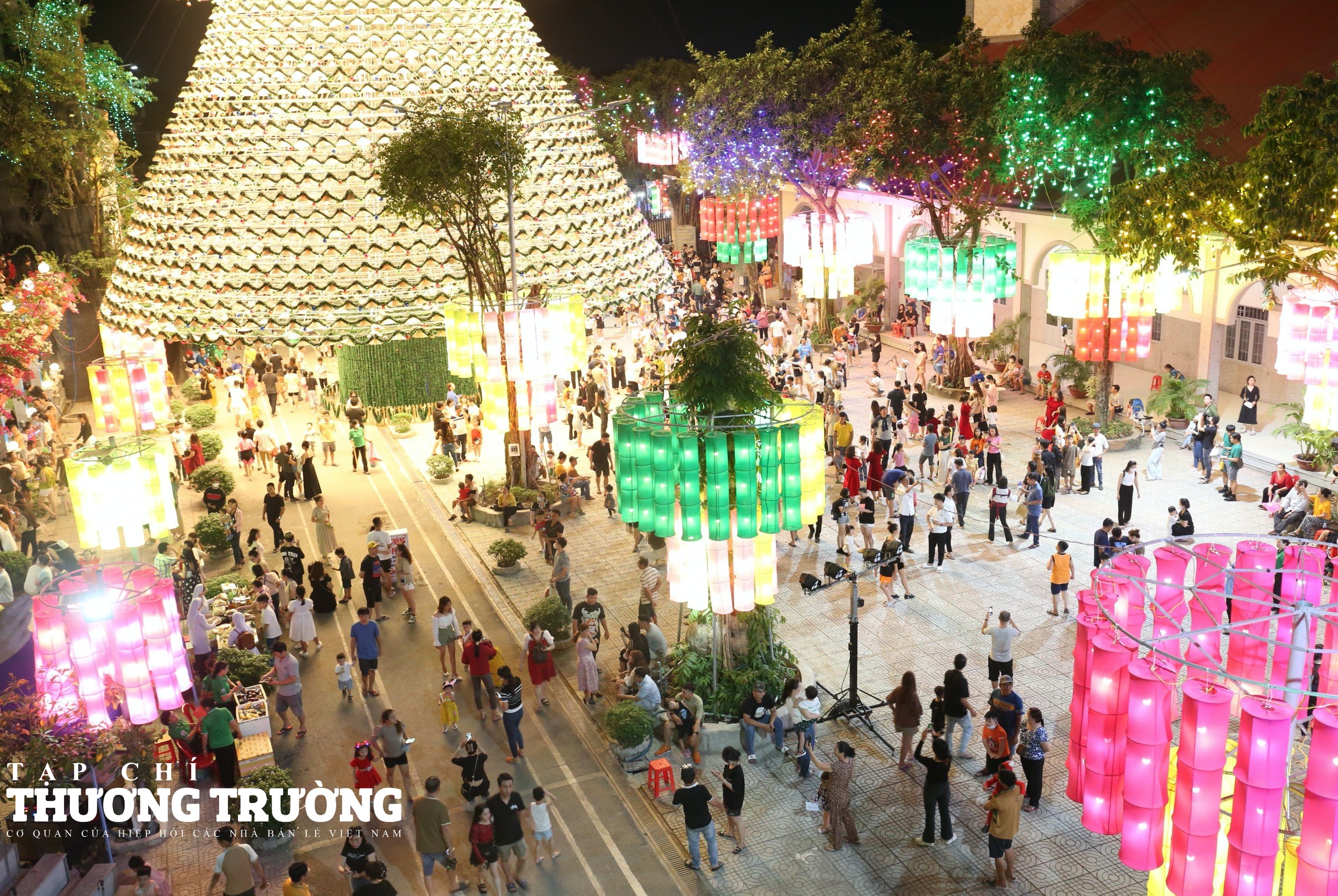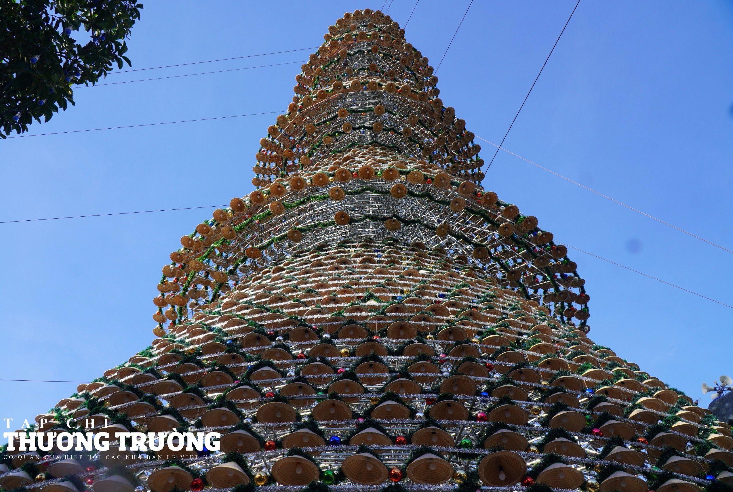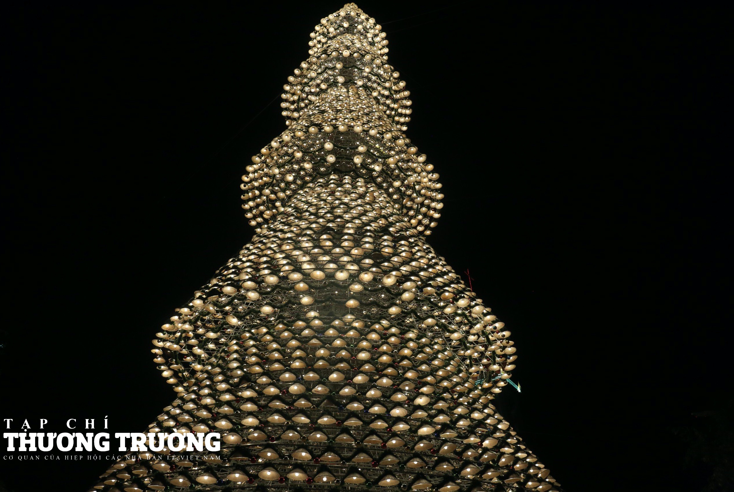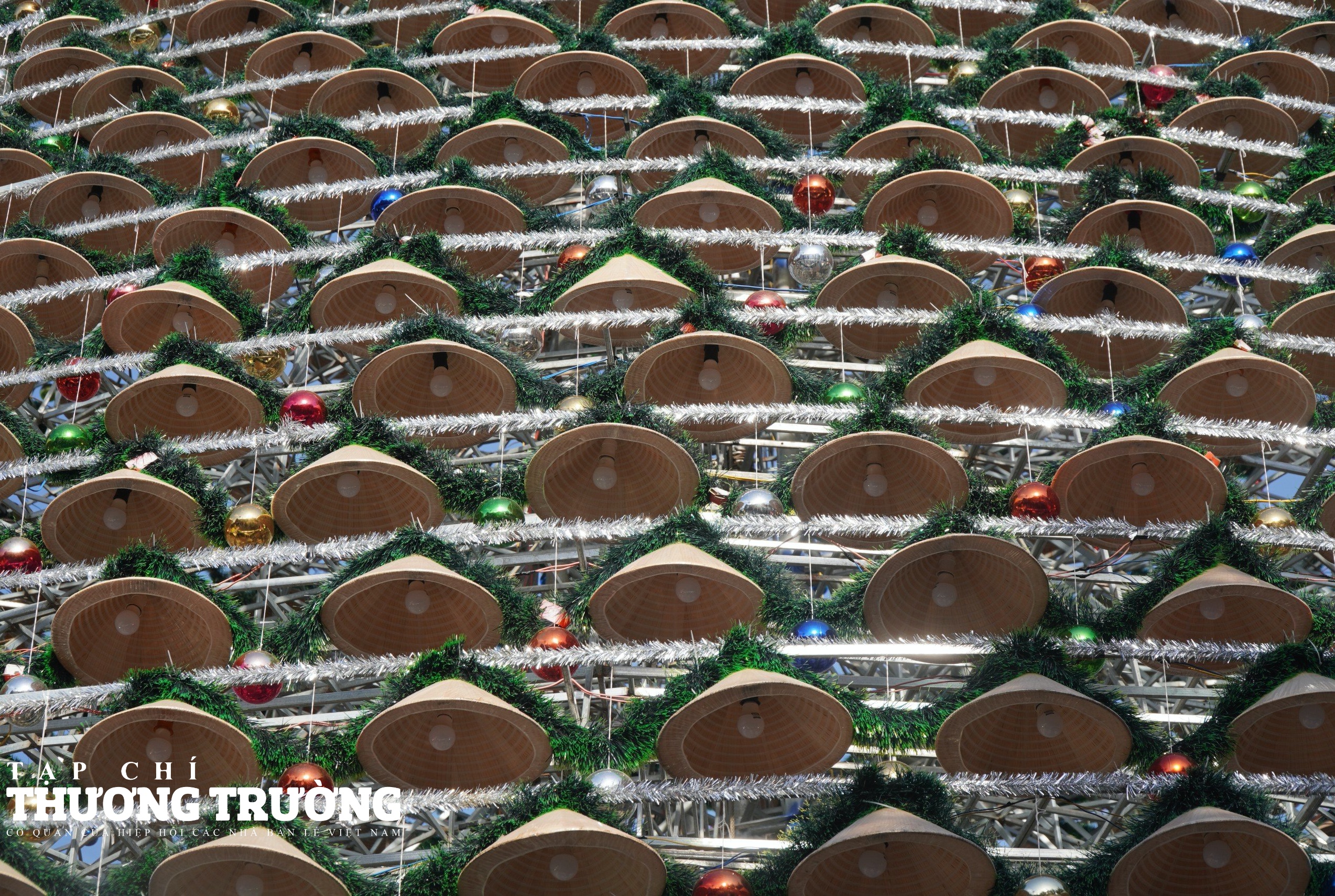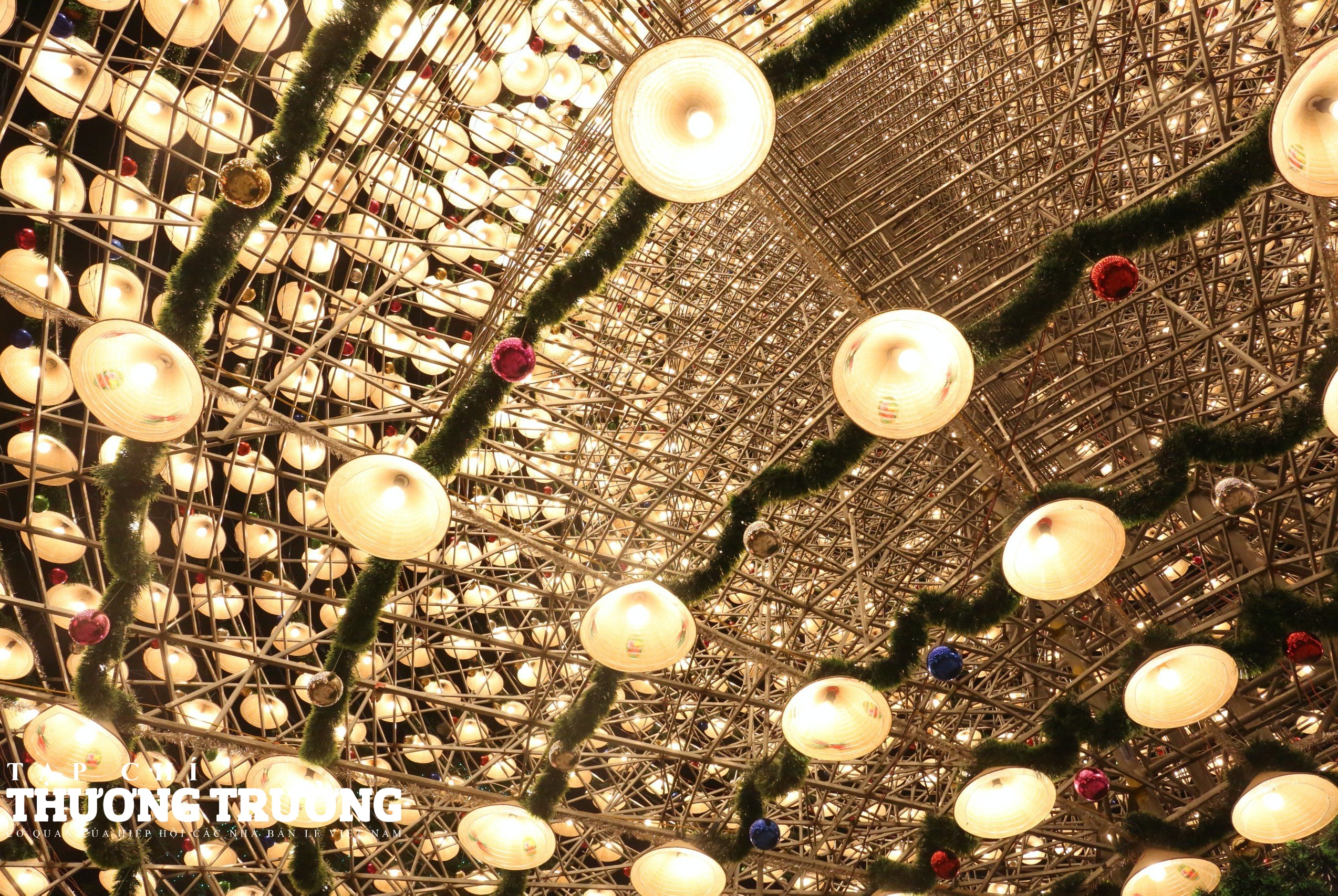 Mỗi chiếc nón được lắp một bóng đèn tạo thành cây thông Noel lung linh, thu hút hàng ngàn người dân đến tham quan mỗi đêm.