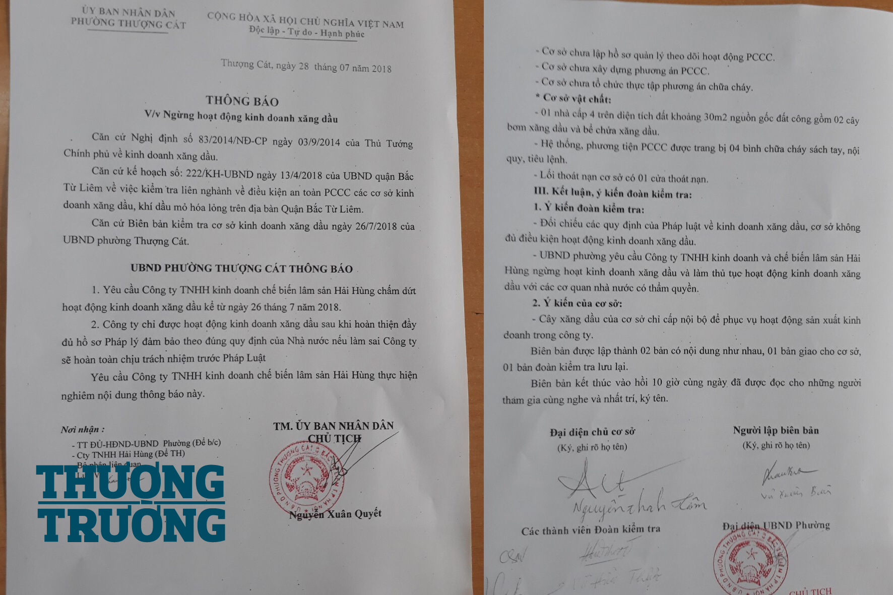 Trước đó Thương trường đã thông tin về việc Công ty Hải Hùng hiện đang xây dựng nhà cấp 4 trên diện tích đất công 30m2, 2 cây bơm xăng dầu và cả bể chứa xăng dầu. UBND phường Thượng Cát đã kiểm tra và thông tin, chiếu theo những quy định của pháp luật, cơ sở kinh doanh xăng dầu này không đủ điều kiện hoạt động và ngày 28/7/2018, UBND phường Thượng Cát ra thông báo yêu cầu Công ty Hải Hùng ngừng hoạt động kinh doanh xăng dầu ngay lập tức.