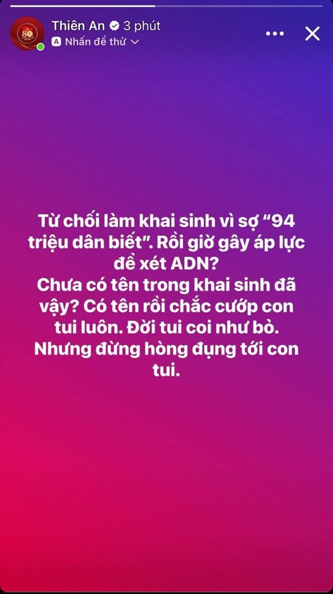 Nhưng khi mọi chuyện vượt quá giới hạn, cô buộc phải lên tiếng: “Từ chối làm giấy khai sinh vì sợ dư luận, rồi giờ lại gây áp lực xét nghiệm ADN? Chưa có tên trong khai sinh đã vậy, có tên rồi chắc cướp con tôi luôn”.