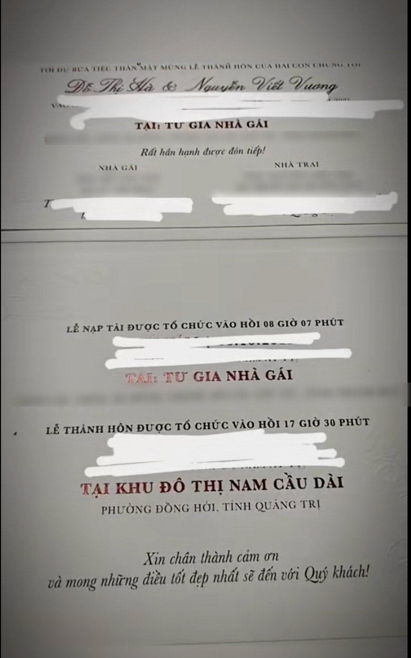 Từ hình ảnh này còn lộ rõ thông tin lễ nạp tài tại tư gia nhà gái, lễ thành hôn tổ chức tại khu đô thị Nam Cầu Dài (TP. Đồng Hới, Quảng Trị - quê nhà chú rể Viết Vương). Được biết, siêu đám cưới sẽ diễn ra trong tháng 10/2025. Đến đây, cư dân mạng vô cùng tò mò về thân thế chàng trai đã chiếm trọn trái tim người đẹp họ Đỗ.