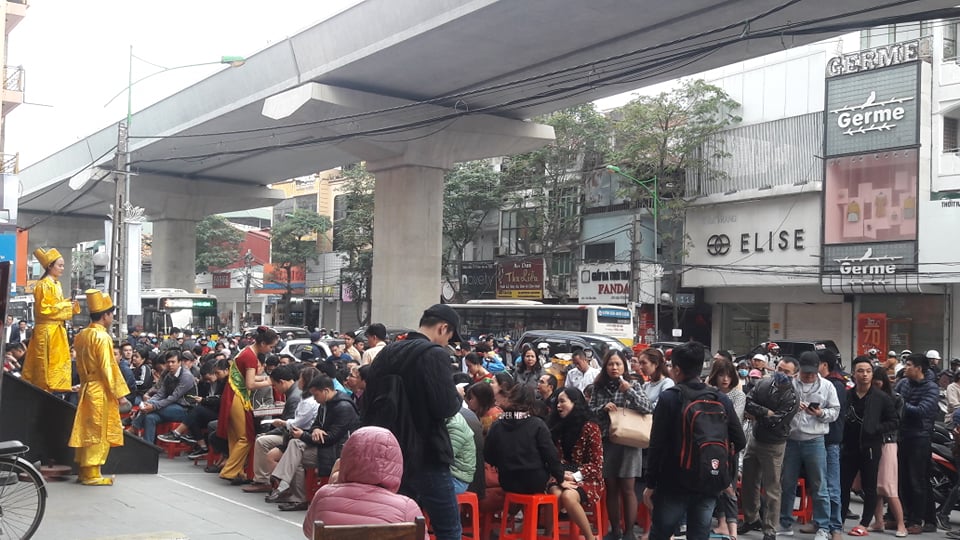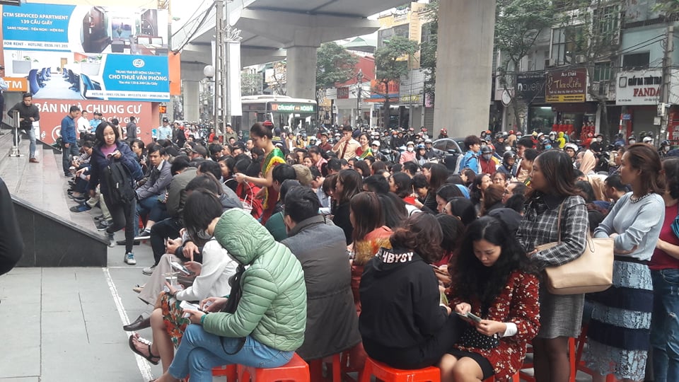 Tại "phố vàng" Cầu Giấy (Hà Nội), ngay trước giờ đi làm, lượng người ngồi chờ để vào mua vàng cũng rất đông. “ Tôi đã phải dậy từ 5 giờ sáng, không kịp ăn uống gì để ra xếp hàng mua cho sớm nhưng đã gần 3 tiếng mà vẫn chưa tới lượt” – chị Thu một khách hàng chia sẻ.