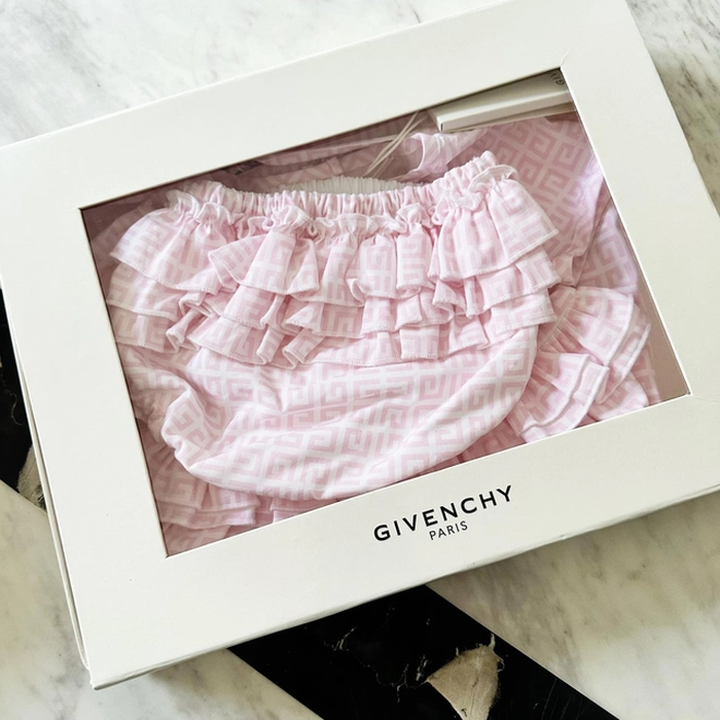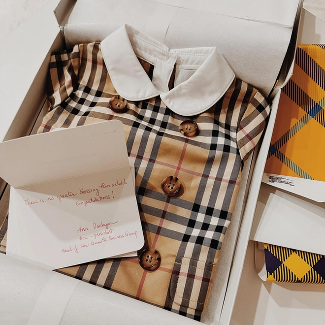 Ngày em bé chào đời, cựu hot girl Hà thành cũng khiến hội chị em lóa mắt, liên tục vào "xin vía" khi khoe loạt quà người thân, bạn bè tặng cho Caroline. Trong đó có cả những món đồ thời trang đến từ những thường hiệu đắt đỏ.