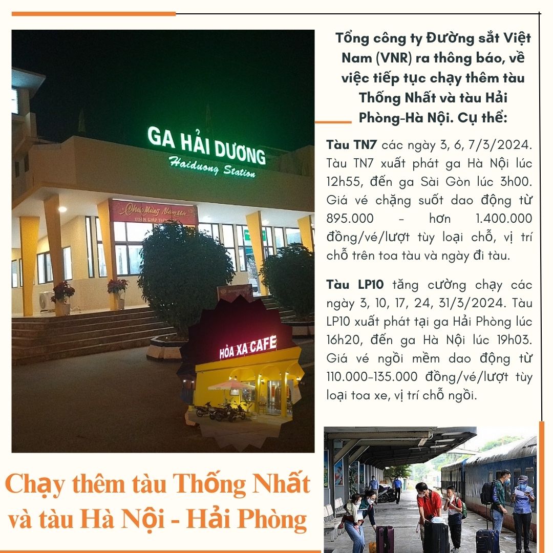 Để đáp ứng nhu cầu đi lại của hành khách sau dịp Tết Nguyên đán Giáp Thìn 2024, Công ty Cổ phần Vận tải đường sắt Hà Nội tiếp tục chạy thêm tàu Thống Nhất và tàu Hải Phòng-Hà Nội.