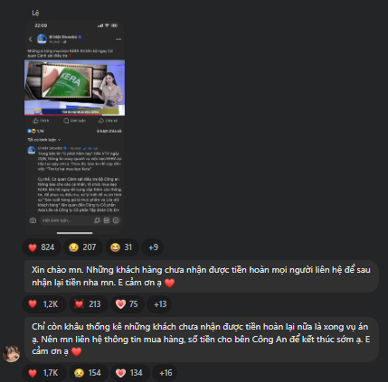 "Chỉ còn khâu thống kê những khách chưa nhận được tiền hoàn lại nữa là xong vụ án ạ. Nên mọi người liên hệ thông tin mua hàng, số tiền cho bên công an để kết thúc sớm. Em cảm ơn ạ”, cô viết thêm.