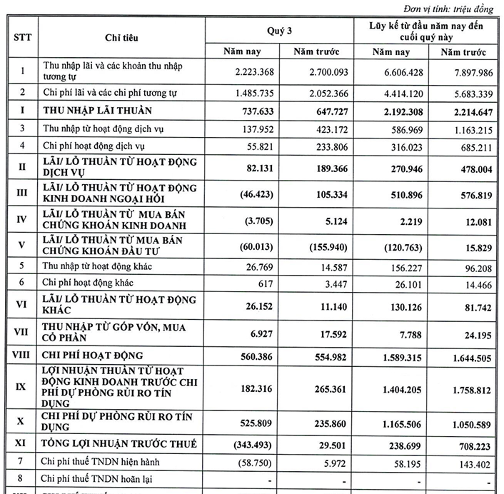 Cụ thể, lãi từ hoạt động dịch vụ giảm gần 57% so với cùng kỳ còn 82 tỷ đồng. Mảng kinh doanh ngoại hối ghi nhận lỗ 46 tỷ đồng, trong khi cùng kỳ vẫn lãi 105 tỷ đồng. Tương tự, mảng mua bán chứng khoán đầu tư và kinh doanh cũng lần lượt lỗ 60 tỷ đồng và 4 tỷ đồng. Thu nhập từ góp vốn mua cổ phần cũng ghi nhận giảm 60,6%, xuống còn 7 tỷ đồng trong quý.