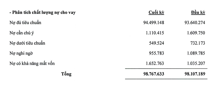 Về chất lượng tài sản, tổng số dư nợ xấu (nợ nhóm 3 đến nhóm 5) của ngân hàng tăng 10,5% lên 3.158 tỷ đồng. Trong đó, nợ dưới tiêu chuẩn và nợ nghi nghờ giảm lần lượt 25% và 12% nhưng nợ có khả năng mất vốn tăng gần 60% lên hơn 1.652 tỷ đồng. Tỷ lệ nợ xấu tăng từ 2,91% hồi đầu năm lên gần 3,2% tại thời điểm cuối quý 3. Tỷ lệ bao phủ nợ xấu của ngân hàng hiện ở mức 53,5%.