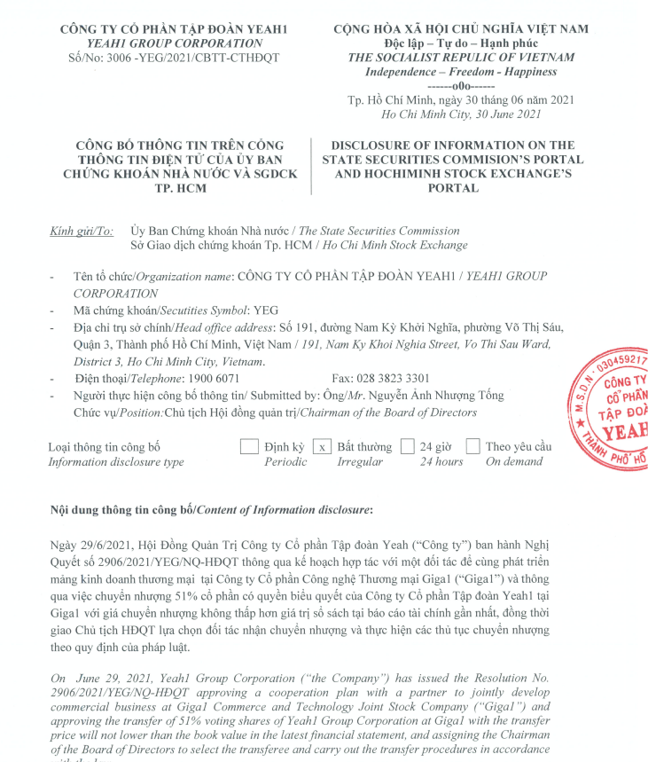 Theo đó, HĐQT Tập đoàn Yeah1 (YEG) đã thông qua Nghị quyết hợp tác với một số đối tác để cùng phát triển mảng kinh doanh thương mại tại CTCP Công nghệ Thương mại Giga1. Đồng thời, Tập đoàn cũng thông qua việc chuyển nhượng 51% cổ phần có quyền biểu quyết của Yeah1 tại Giga1.