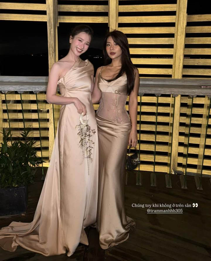 Theo đó, cả hai mỹ nhân Hà Thành đều chọn diện cùng một mẫu váy, đó là chiếc váy lụa satin dài thướt tha có điểm nhấn là phần eo corset ren. Thiết kế tông màu be vừa chuẩn dresscode đám cưới, vừa tôn lên vòng 2 "con kiến" đỉnh chóp của Chi Pu và Thanh Huyền, bảo sao "hai ý tưởng lớn gặp nhau" ngay tại đám cưới hot hit này.