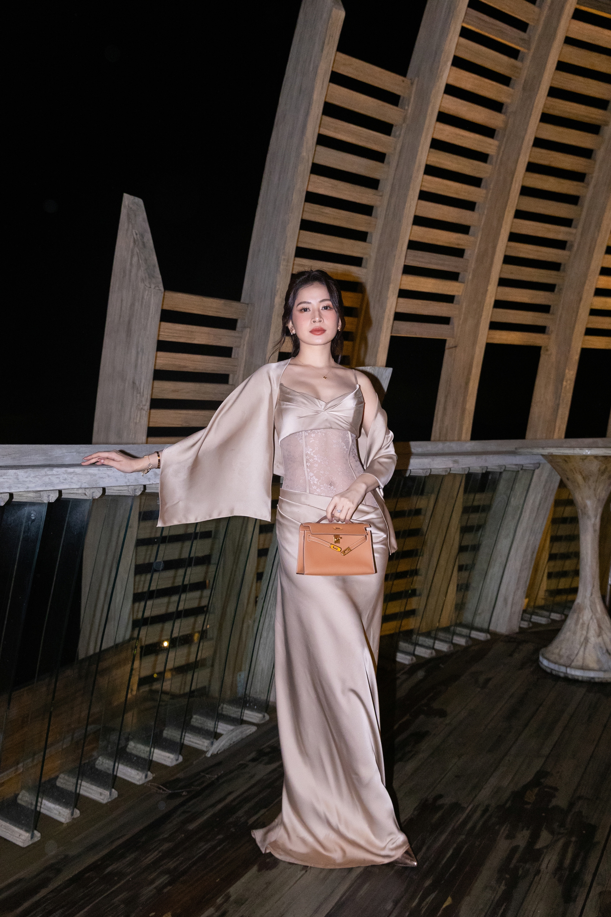Người đẹp nâng tầm trang phục cực khéo nhờ phối thêm khăn lụa cùng túi Hermès Kelly màu nâu da bò, trị giá hàng trăm triệu đồng.