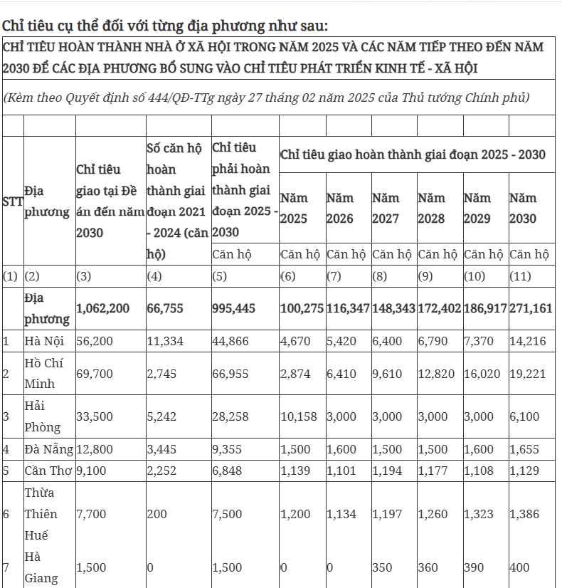 Tại Quyết định số 444/QĐ-TTg ngày 27/2/2025, Thủ tướng Chính phủ giao chỉ tiêu số căn hộ các địa phương phải hoàn thành giai đoạn 2025 - 2030 là 995.445 căn hộ; trong đó năm 2025 là 100.275 căn hộ, năm 2026 là 116.347 căn hộ, năm 2027 là 148.343 căn hộ, năm 2028 là 172.402 căn hộ; năm 2029 là 186.917 căn hộ và năm 2030 là 271.161 căn hộ.