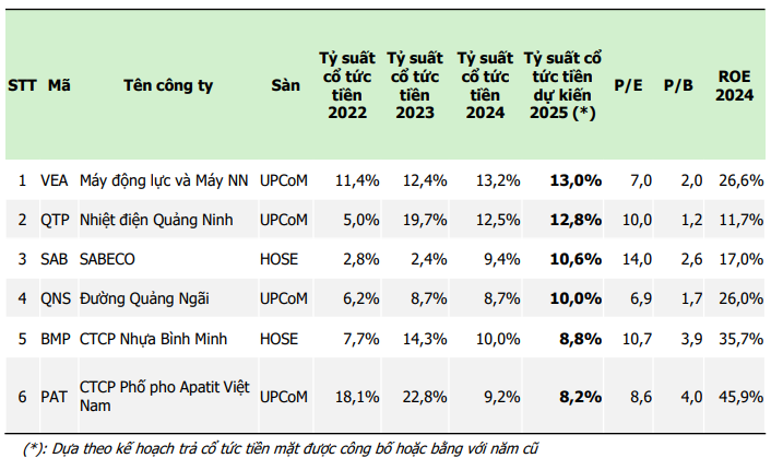 CTCP Phốt pho Apatit Việt Nam (UPCOM: PAT) trả cổ tức tiền năm 2022, 2023, 2024 lần lượt là 18,1%; 22,8%; 9,2%/năm. Với thị giá hiện tại và tỷ lệ trả cổ tức dự kiến cho năm 2025, tỷ suất cổ tức tiền của PAT đang ở mức cao là 8,2%/năm.