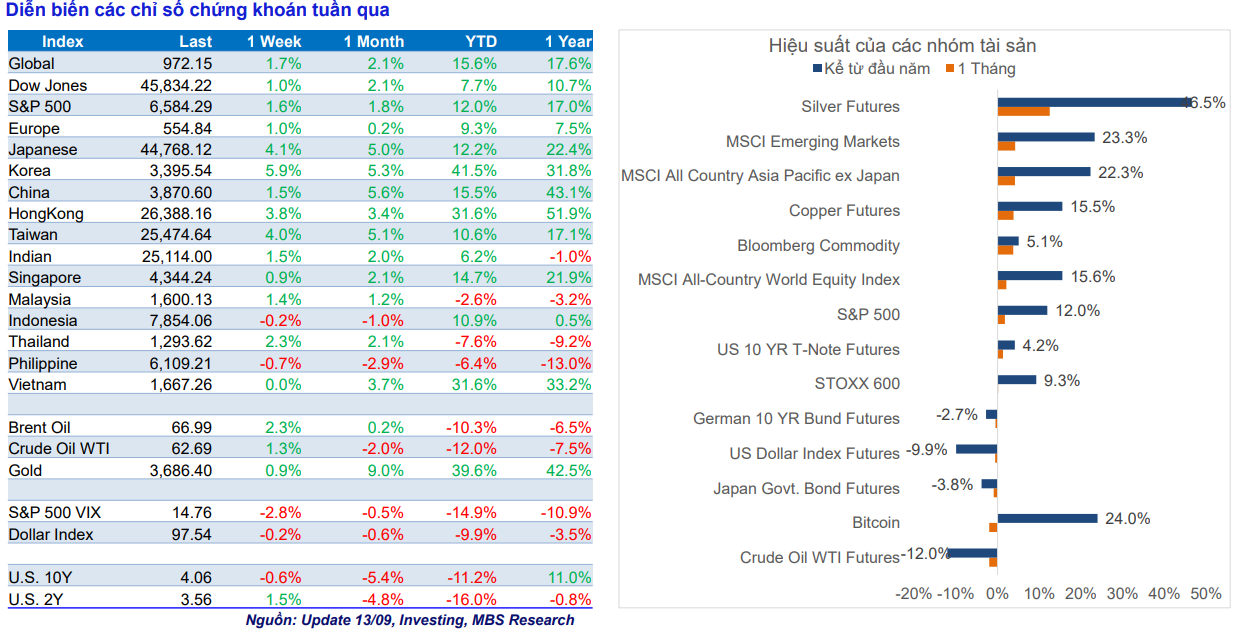 Theo công cụ FedWatch của CME, thị trường đặt cược 100% khả năng Fed hạ lãi suất trong cuộc họp tới: 90% khả năng giảm 0,25 điểm phần trăm, gần 10% cho kịch bản giảm 0,5 điểm phần trăm. Xa hơn, khả năng có thêm một đợt giảm vào tháng 10 đã tăng lên 86%, và một lần nữa vào tháng 12 lên tới 79%. Diễn biến này là động lực chính thúc đẩy dòng vốn toàn cầu trở lại với các tài sản rủi ro, trong đó chứng khoán hưởng lợi rõ rệt.