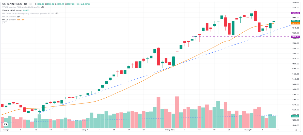 Xét về kỹ thuật, vùng hỗ trợ ngắn hạn của VN-Index nằm ở 1.600–1.615 điểm, trong khi kháng cự ở 1.694–1.700 điểm. Kịch bản cơ sở là thị trường duy trì xu hướng tăng trong trạng thái tái tích lũy, với động lực đến từ dòng tiền vào nhóm cổ phiếu vừa và nhỏ.