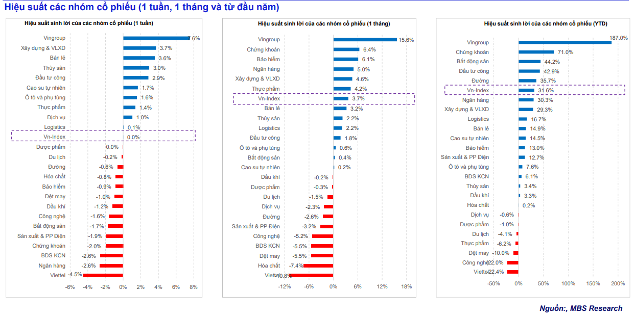 Đà phục hồi đến từ nhóm cổ phiếu trụ, giúp VN30 tăng 1,1%, trong khi nhóm Midcap và Smallcap giảm lần lượt -1,5% và -1,1%. Các nhóm ngành nổi bật gồm Vingroup (+7,8%), Xây dựng & VLXD (+3,7%), Bán lẻ (+3,6%). Ở chiều ngược lại, Viettel (-4,5%) và Ngân hàng (-2,6%) gây áp lực giảm.
