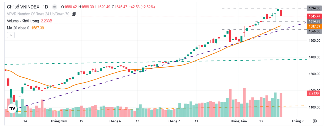 Đáng chú ý, khối ngoại tiếp tục bán ròng tuần thứ năm liên tiếp với giá trị 7.900 tỷ đồng, tập trung vào các mã vốn hóa lớn, nâng tổng bán ròng từ đầu tháng 8 lên hơn 31.000 tỷ đồng. Độ rộng thị trường thu hẹp đáng kể khi nhiều nhóm ngành như viễn thông, thép và bất động sản giảm 7–10% ngay cả khi VN-Index chỉ lùi nhẹ so với đỉnh.