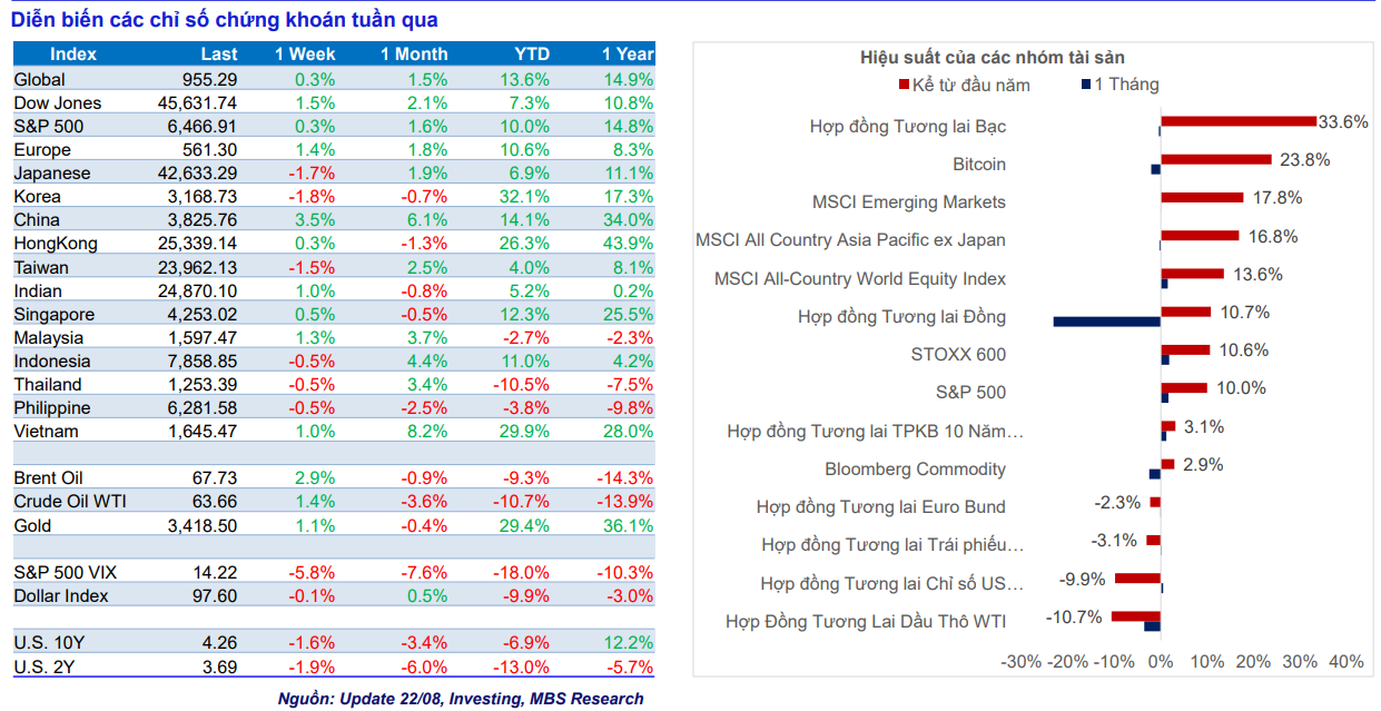 Tại Việt Nam, VN-Index tăng gần 1% lên 1.645 điểm, ghi nhận tuần tăng thứ ba liên tiếp. Đà tăng chủ yếu đến từ nhóm VN30 (+1,73%) với tâm điểm là cổ phiếu ngân hàng. Dòng tiền nội dồn mạnh vào các mã VPB, MBB, HDB với mức tăng 27–60% chỉ trong một tháng. Ngược lại, nhóm midcap và smallcap lần lượt giảm 2% và 3,3%, cả hai cùng có ba phiên giảm liên tiếp.
