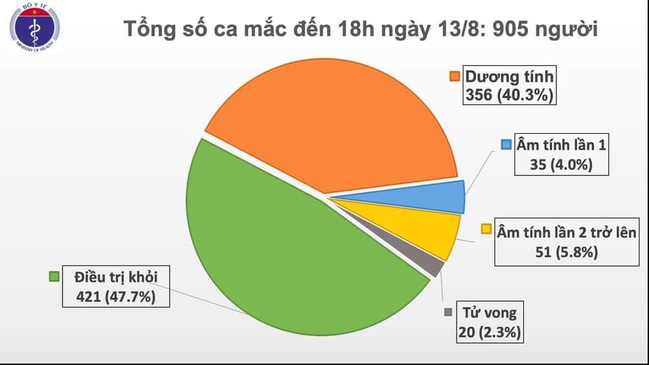 - Tính đến 18h ngày 13/8: Việt Nam, có tổng cộng 905 ca mắc COVID-19, trong đó 327 ca nhiễm nhập cảnh được cách ly ngay.