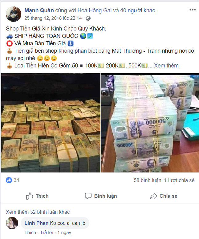 Phóng viên vào một trang Facebook cá nhân có tên “Bán tiền giả - Uy tín chất lượng”, trang cá nhân này có tới 5 nghìn người theo dõi. Người này đăng tải những hình ảnh các cọc tiền mệnh giá từ 100.000 đến 500.000 đồng kèm theo lời chào mời rất lọt tai “tiêu xài thoải mái, không lo bị lộ”; “giống tiền thật tới 99%”. Giá cụ thể, 1 triệu tiền thật có thể mua được 10 triệu tiền giả.
