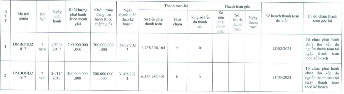 Cụ thể, ngày 30/11/2021 là ngày thanh toán của trái phiếu DMBOND2017 với giá trị tiền lãi là 5,48 tỷ đồng và tiền chậm thanh toán là 13,39 triệu đồng. Nhưng phải đến ngày 09/12/2022, Đường Man mới thanh toán với lý do chưa thu xếp đủ nguồn tiền để thanh toán theo kế hoạch.
