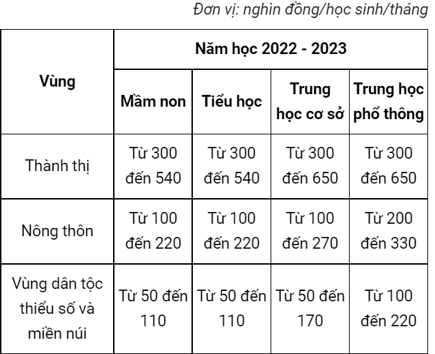 Khung học phí năm học 2022 - 2023 (mức sàn - mức trần) đối với cơ sở giáo dục mầm non, giáo dục phổ thông công lập chưa tự bảo đảm chi thường xuyên theo Nghị định 81/2021 của Chính phủ.