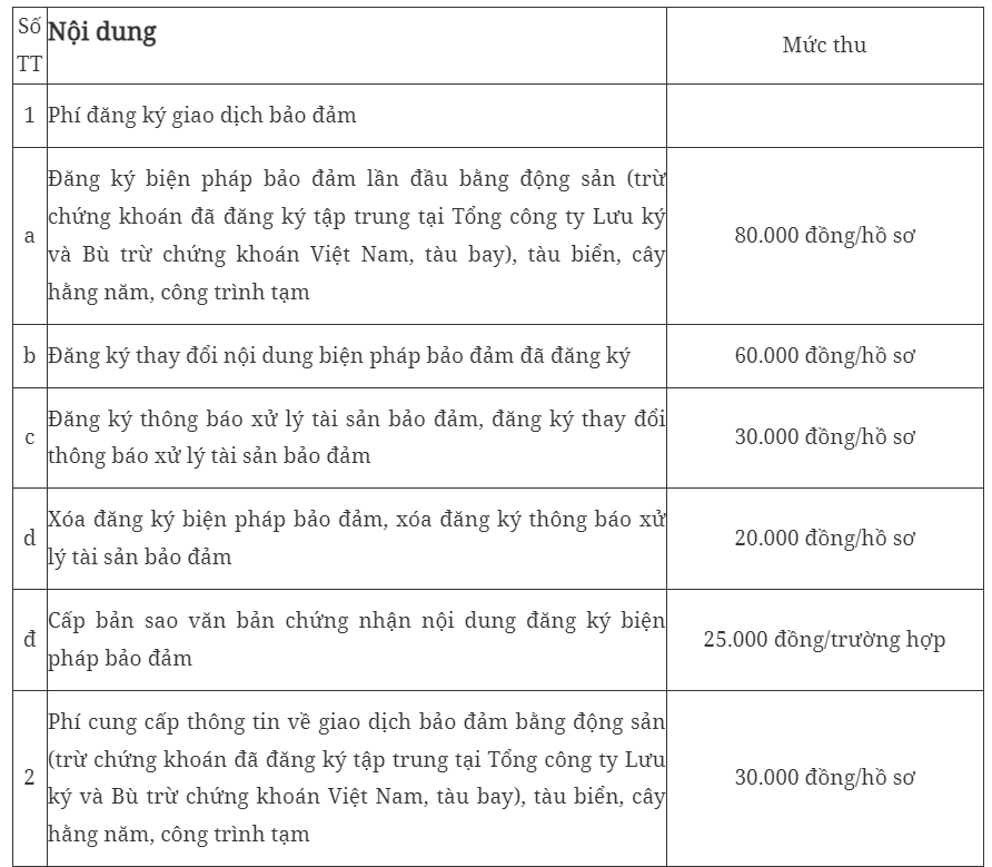 Biểu mức thu phí trong lĩnh vực đăng ký giao dịch bảo đảm được quy định như sau: