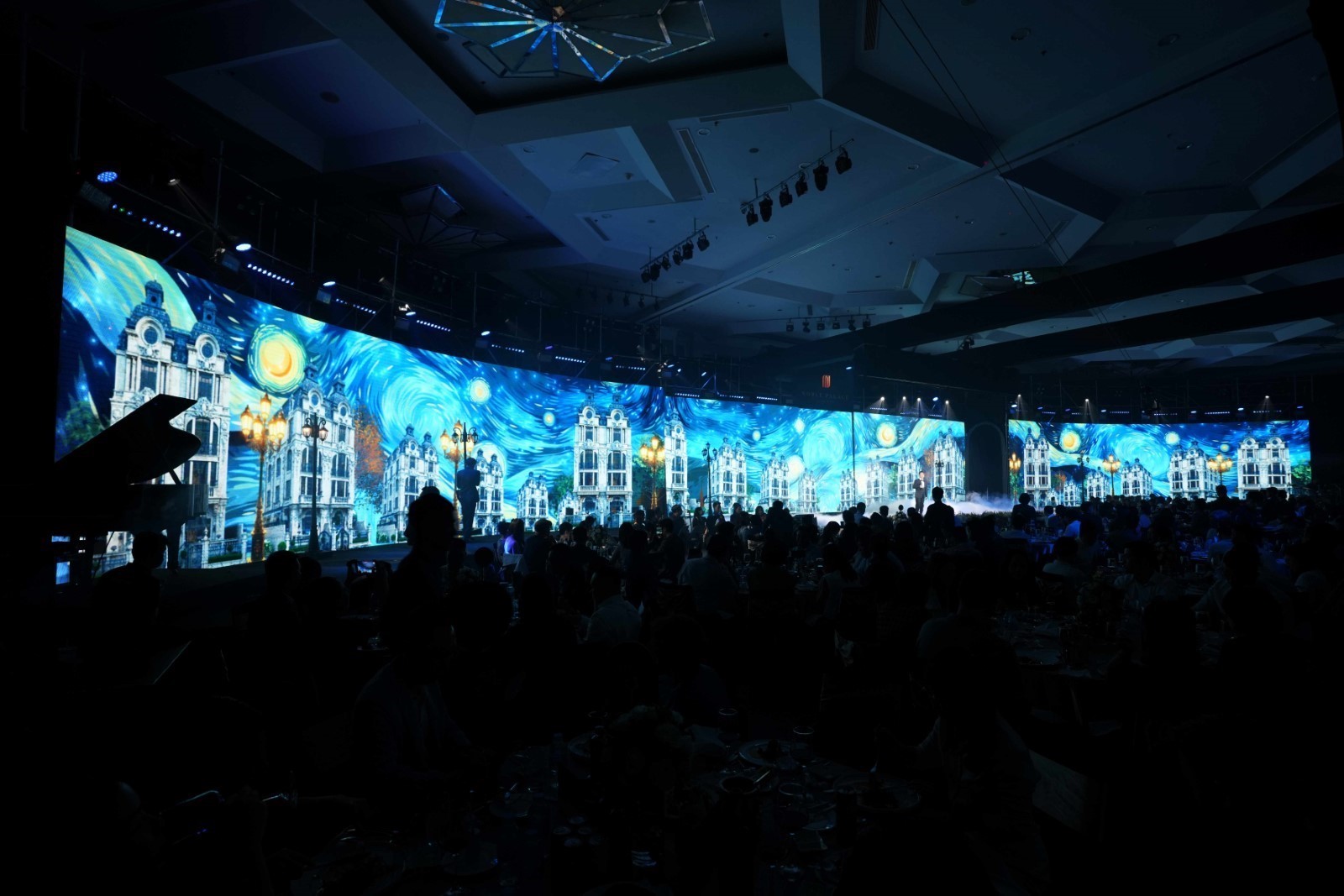 Kiến trúc tinh tế của Noble Palace Long Biên trong màn trình diễn của ca sĩ Bằng Kiều, lấy cảm hứng từ kiệt tác "Đêm đầy sao" của danh hoạ Van Gogh.
